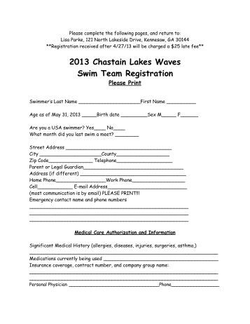 Group lesson registration is only by mail. You will receive one confirmation email when your registration is complete. SWIMMING LESSON REGISTRATION FORM Swimmer Name _____ Birthday _____ Age _____ Parent/Guardian Name ... View Full Source